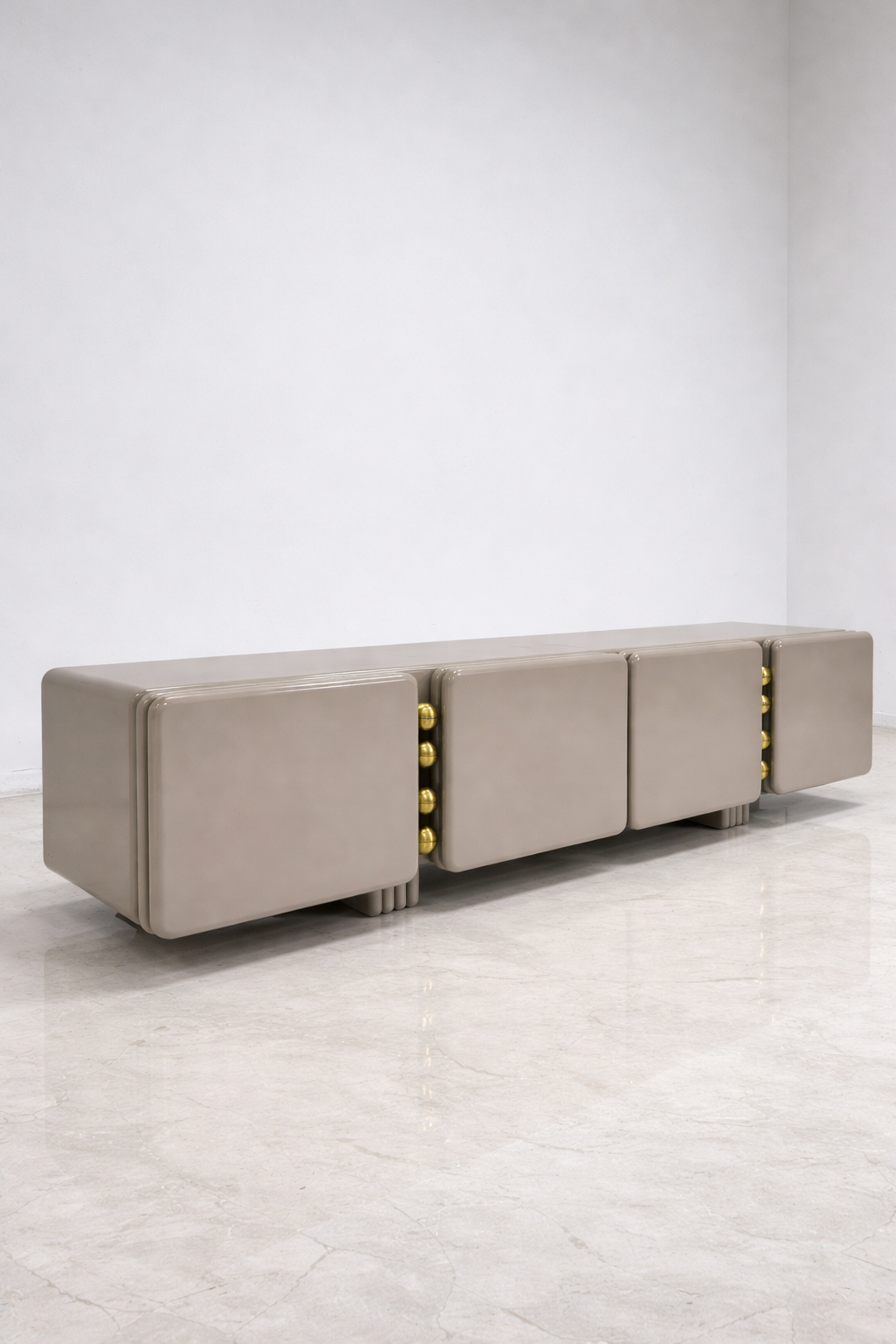 Ce meuble TV d’importation se distingue par un design contemporain haut de gamme, alliant élégance et raffinement. Il présente une structure basse et allongée, idéale pour les intérieurs modernes et luxueux. La finition laquée taupe apporte un rendu lisse et sophistiqué, tout en offrant une excellente résistance et une facilité d’entretien.