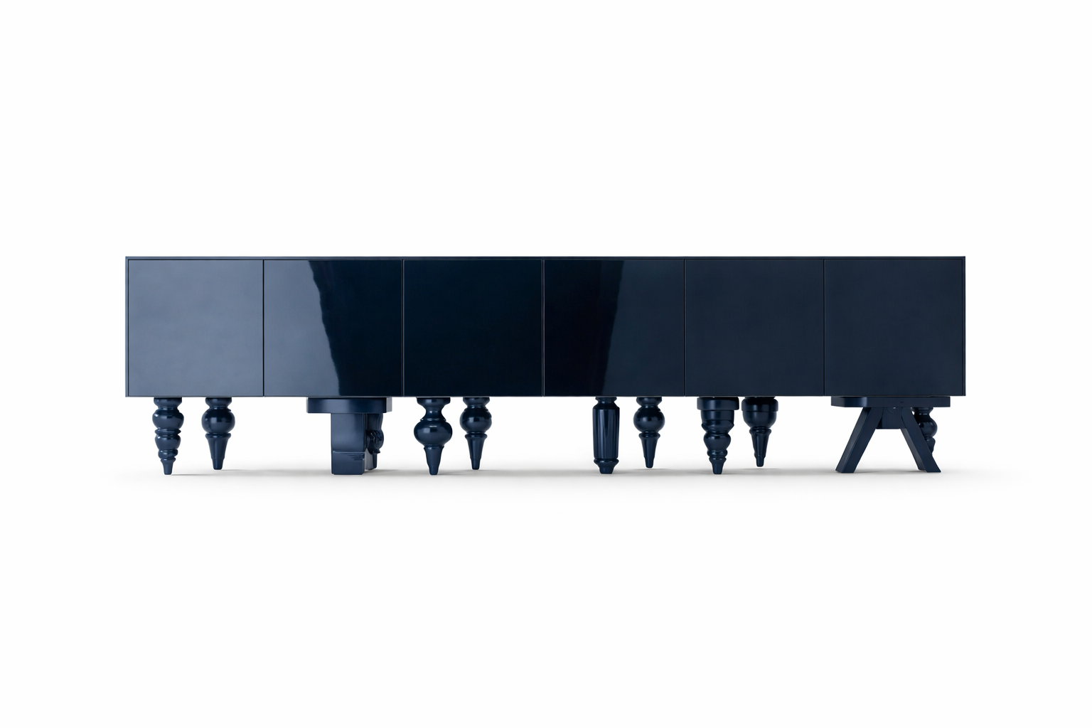 La finition bleu foncé profond à l’aspect brillant apporte une touche sophistiquée et luxueuse, tout en reflétant subtilement la lumière. Les façades lisses et épurées renforcent le style minimaliste du meuble, créant un contraste harmonieux avec son élément le plus distinctif : les pieds sculptés et variés, aux formes travaillées et artistiques. Chaque pied possède un design unique, donnant au meuble une identité forte et originale.