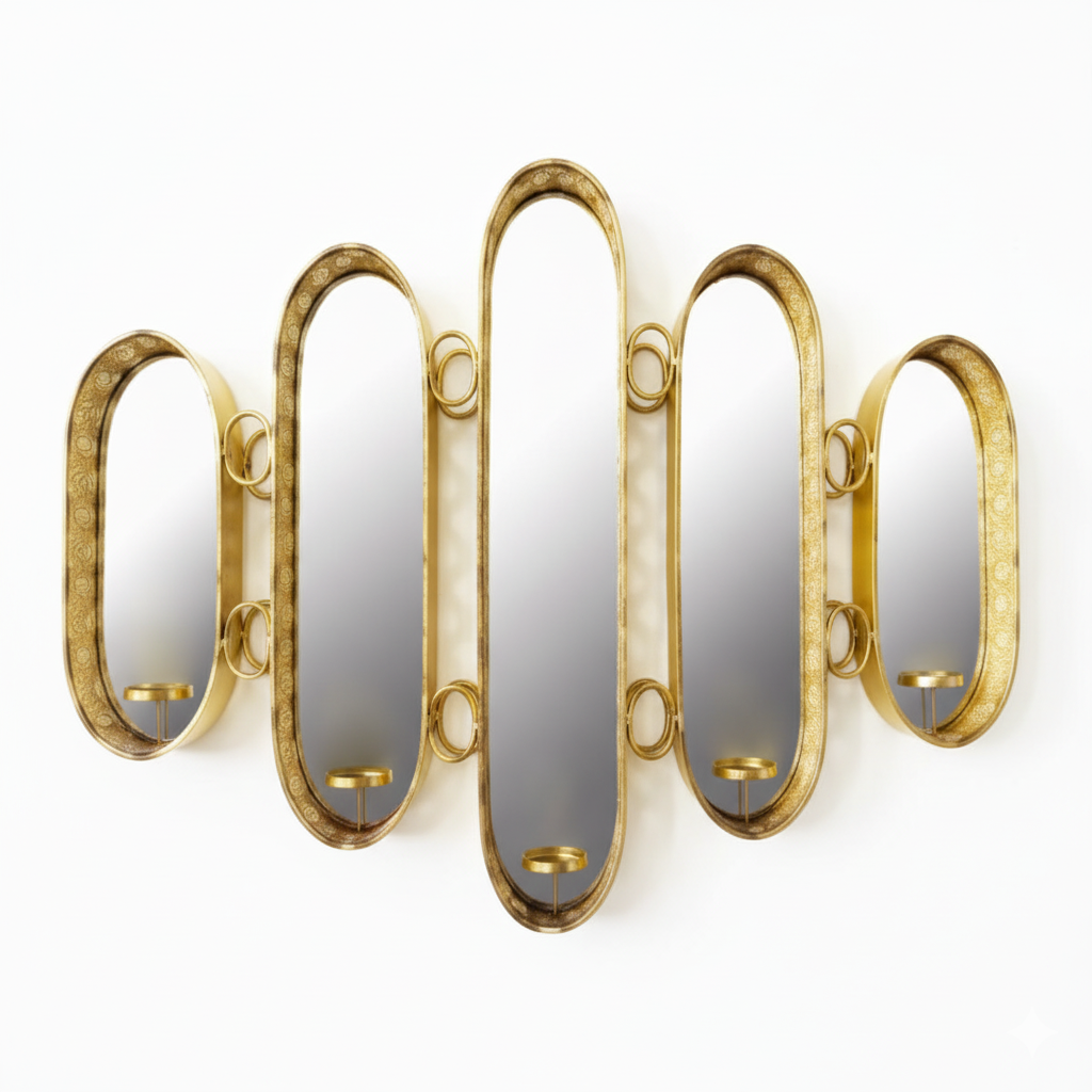 Ce miroir mural se compose d’un ensemble harmonieux de cinq miroirs oblongs disposés à l’horizontale. L’ensemble, de couleur dorée, mêle raffinement et originalité. Les deux miroirs extérieurs, plus petits, se distinguent par leurs cadres ornés de motifs délicats, tandis que les trois miroirs centraux, plus grands, affichent une simplicité élégante. Chaque miroir repose sur une base discrète pouvant accueillir un bougeoir, alliant ainsi fonctionnalité et esthétique décorative.