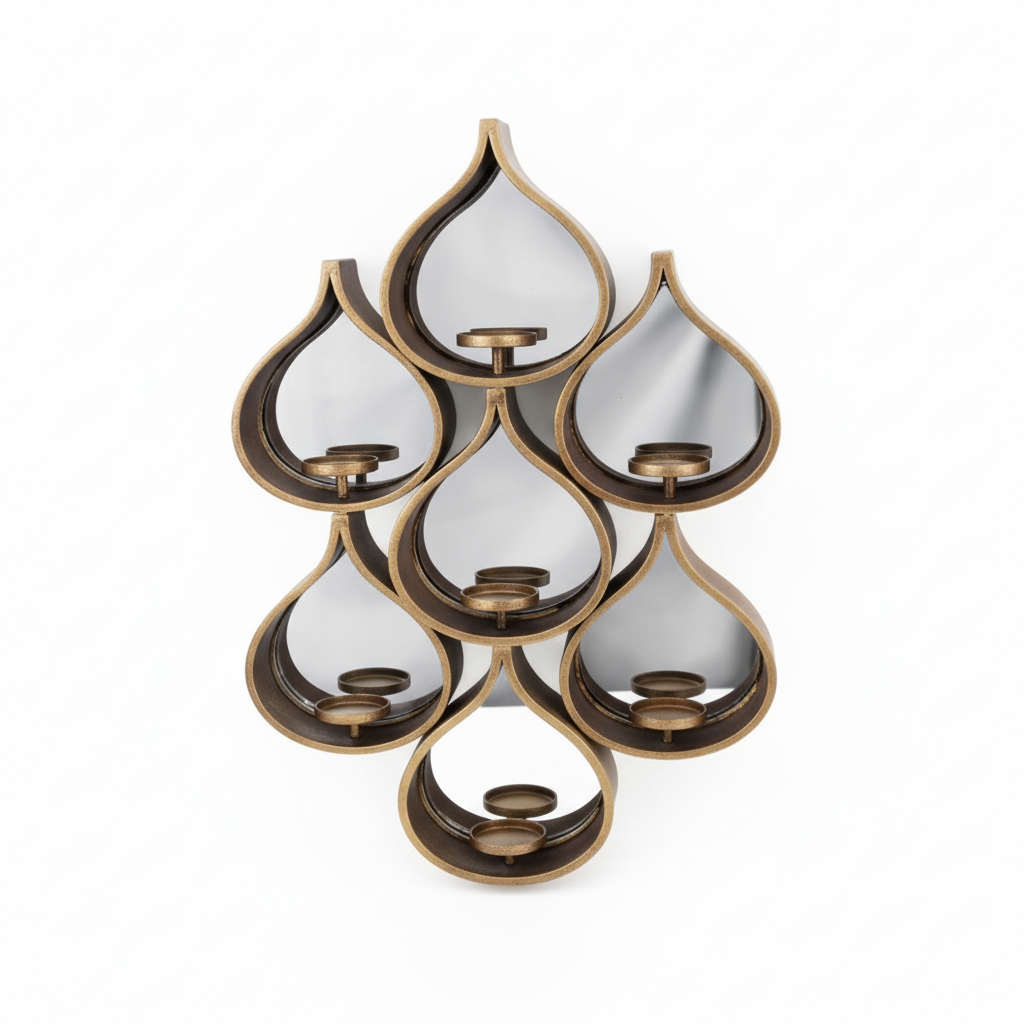 Ce miroir mural décoratif se compose de sept miroirs en forme de goutte d’eau, disposés en grappe pour créer une composition originale et fluide. Chaque miroir est encadré d’une monture dorée patinée qui accentue son caractère raffiné et chaleureux. La plupart des miroirs intègrent un petit support destiné à accueillir une bougie chauffe-plat, permettant d’ajouter une touche lumineuse et conviviale. L’ensemble dégage un aspect organique et moderne, idéal pour apporter style et éclat à un intérieur.