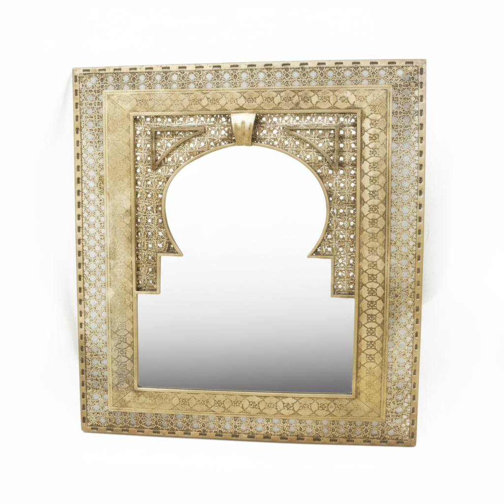 Ce miroir est sublimé par un cadre doré richement travaillé, inspiré de l’architecture marocaine. Sa partie supérieure adopte une forme arquée caractéristique, conférant à l’ensemble une allure majestueuse. Le cadre est finement orné de motifs géométriques et floraux, qui rappellent le raffinement de l’artisanat oriental. Véritable pièce décorative, ce miroir est l’accessoire parfait pour apporter une touche d’élégance et d’exotisme à un intérieur au style oriental.