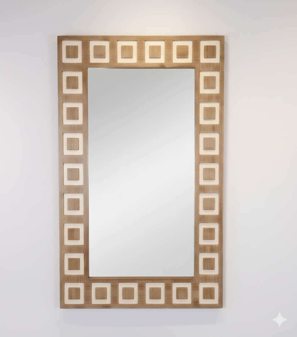 Ce miroir rectangulaire est encadré d’un large contour en bois clair ou beige, travaillé avec soin. Son cadre est orné de motifs géométriques composés de carrés creux alignés tout autour, créant un effet graphique original. Ce design subtil et structuré lui confère une allure contemporaine, idéale pour apporter une touche moderne et décorative à un intérieur.