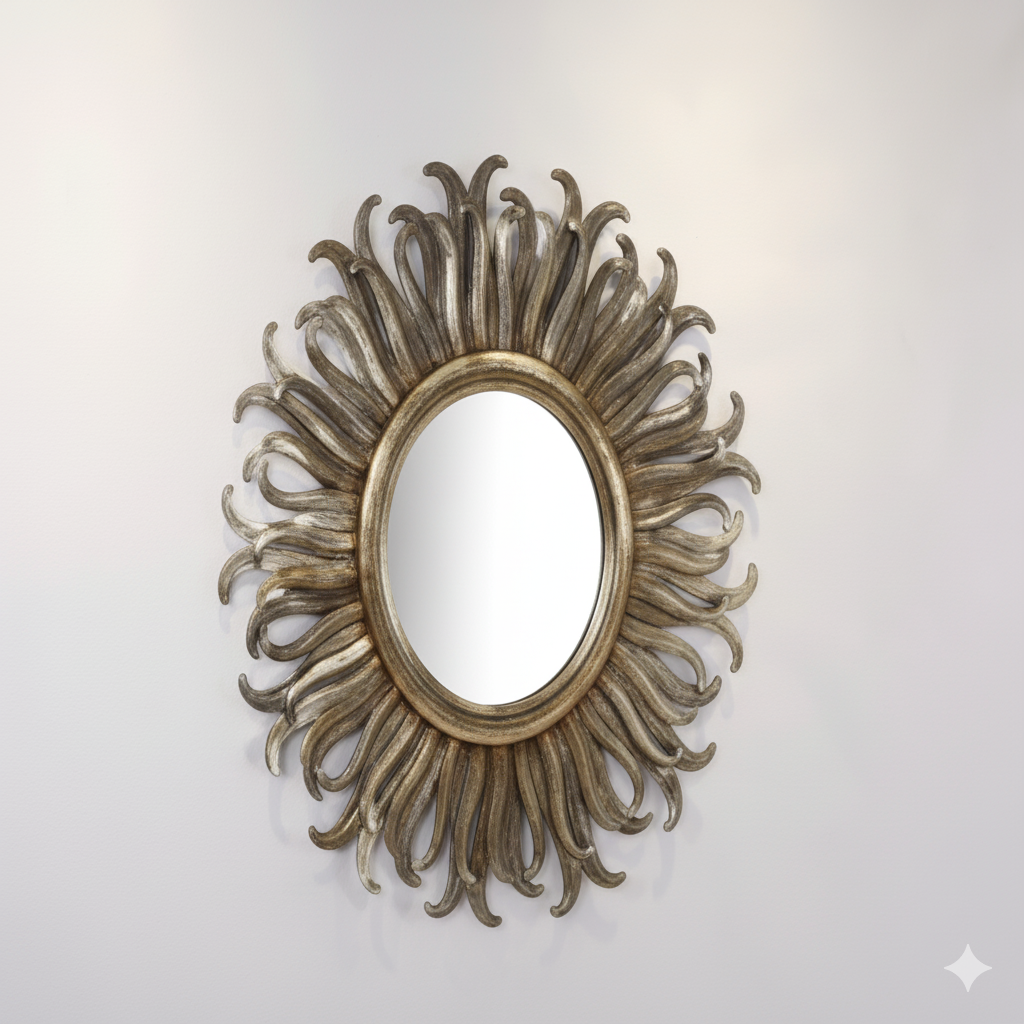 Ce miroir rond est orné d’un cadre travaillé en forme de soleil, dont les rayons stylisés s’étirent avec élégance tout autour. Sa finition dorée et patinée lui confère un caractère antique plein de charme. Les rayons, aux formes incurvées et texturées, apportent mouvement et dynamisme visuel. Le miroir central, sobre et épuré, met en valeur l’originalité et la richesse du cadre, transformant cette pièce en un véritable objet décoratif.