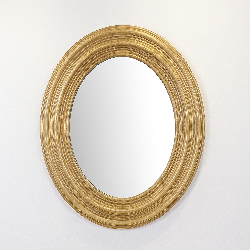 Ce miroir est de forme ovale et encadré d’un cadre large en ton doré clair. Le cadre présente une texture régulière et travaillée, avec des lignes ou motifs en relief qui lui donnent du caractère et de la profondeur. Sa teinte légèrement patinée apporte un aspect chaleureux et élégant. Le miroir central, simple et épuré, contraste avec la richesse du cadre, ce qui met en valeur son design raffiné et classique.