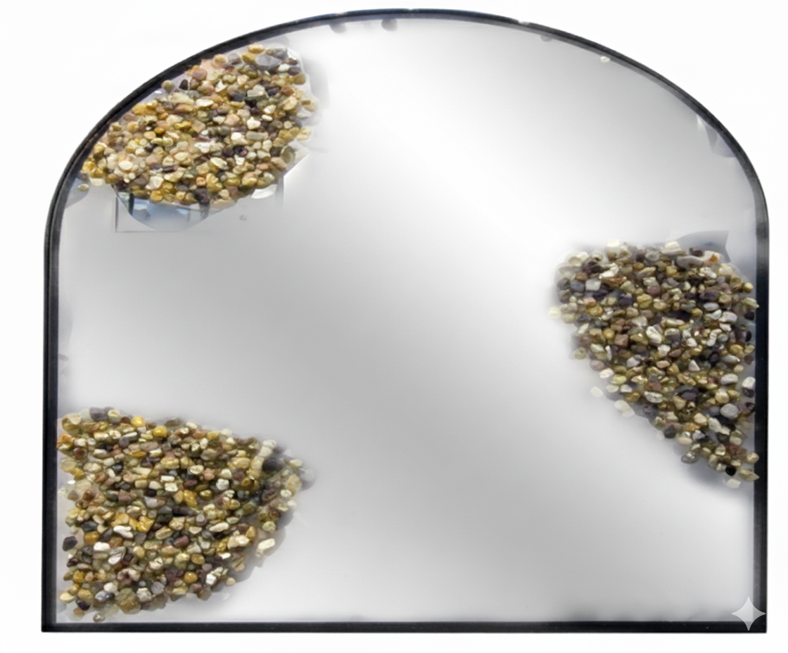 Sa surface est ornée de trois motifs décoratifs composés de petits cailloux aux teintes naturelles — beige, marron et gris. Ces incrustations sont placées dans le coin supérieur gauche, le coin inférieur gauche et le coin droit, apportant une touche minérale et artistique.