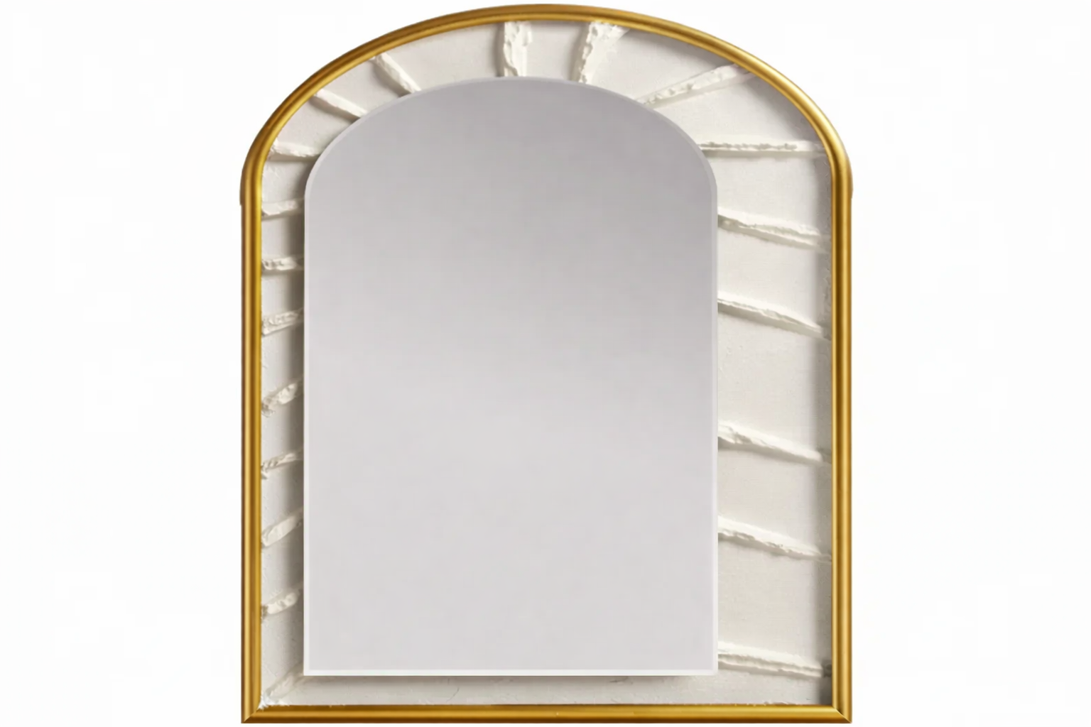 Ce miroir présente une forme rectangulaire surmontée d’un sommet arrondi, inspirée de l’architecture en arche. Son cadre épais, de couleur noire, met en valeur une surface intérieure blanche au fini texturé. Cette texture, composée de lignes horizontales et diagonales, crée un subtil effet de relief. En son centre se trouve un miroir plus petit, reprenant la même forme arquée, qui apporte profondeur et originalité à l’ensemble.