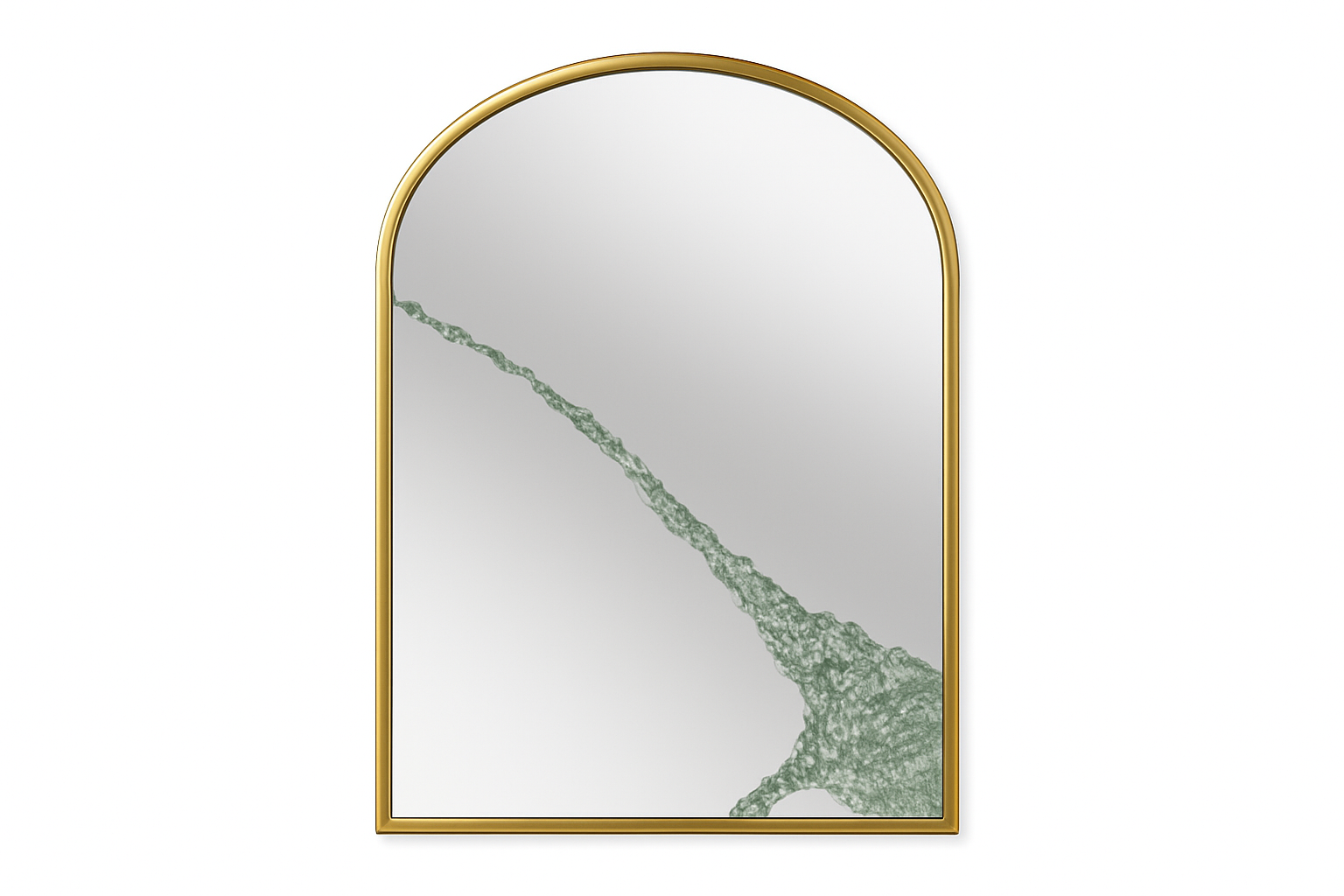 Ce miroir présente une forme rectangulaire élégante avec un sommet arrondi, rappelant une arche. Son cadre fin et raffiné est doré, apportant une touche de sophistication et de luminosité. La surface réfléchissante est traversée par un motif décoratif en diagonale, ressemblant à une fissure artistique aux reflets verdâtres, qui ajoute du caractère et une originalité unique à l’ensemble.