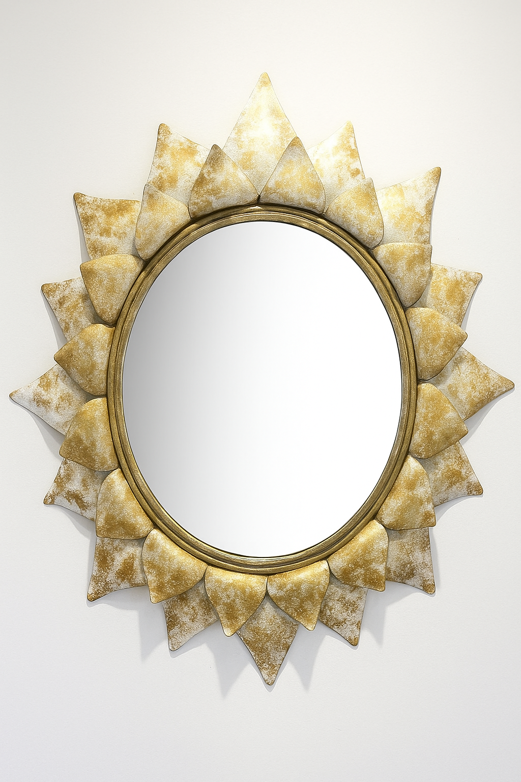 Ce miroir est de forme ronde, entouré d’un cadre doré décoratif en forme de soleil. Le cadre est composé de motifs triangulaires et courbés, disposés comme des rayons solaires, donnant un aspect lumineux et artistique à l’ensemble. La finition dorée, légèrement texturée et patinée, apporte un effet vintage et élégant. C’est un objet décoratif à la fois fonctionnel et ornemental, idéal pour servir de pièce maîtresse dans une décoration murale.