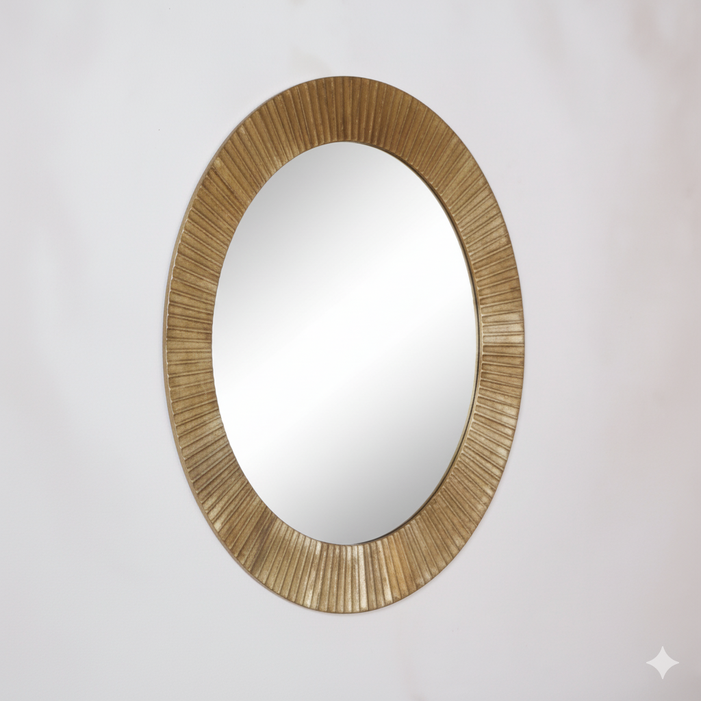 Ce miroir rond est entouré d’un cadre en bois doré, orné d’une texture striée rappelant des rayons solaires ou des ondulations. Ce motif apporte du relief et un charme artisanal, tout en diffusant une atmosphère chaleureuse. Le miroir central, sobre et épuré, s’inscrit dans un style rustique chic, idéal pour associer authenticité et élégance dans une décoration intérieure.