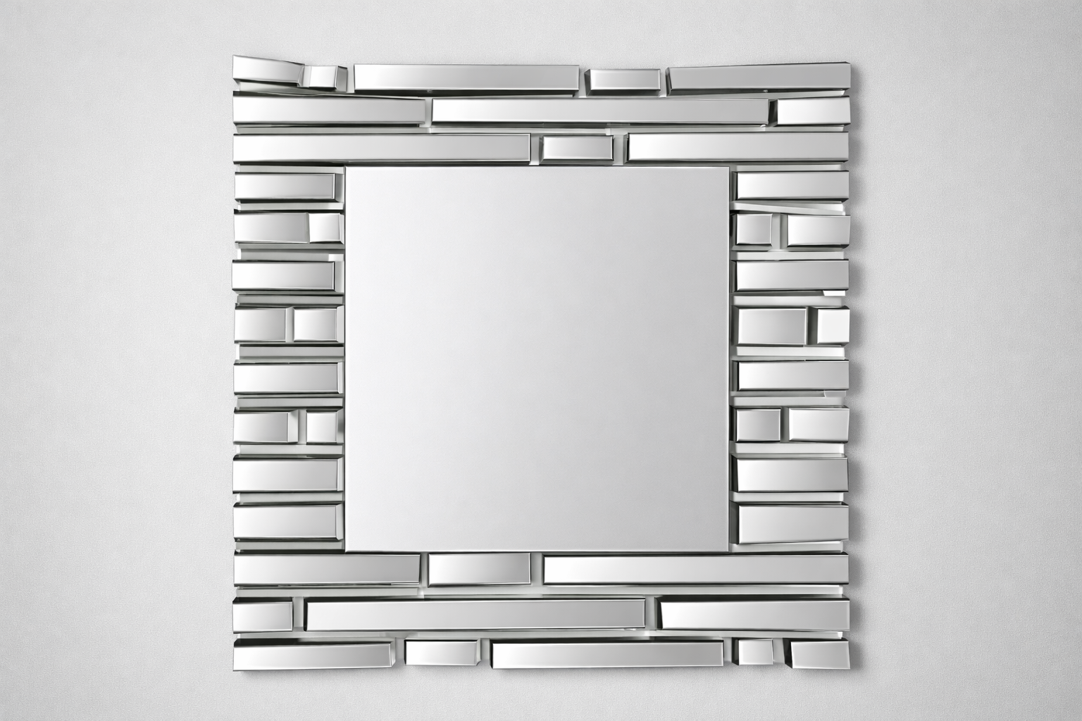 Son cadre se distingue par une composition de pièces rectangulaires en miroir, disposées de manière géométrique et décalée. Ce jeu de volumes et de superpositions crée un effet de relief et de profondeur, tout en captant la lumière sous différents angles.