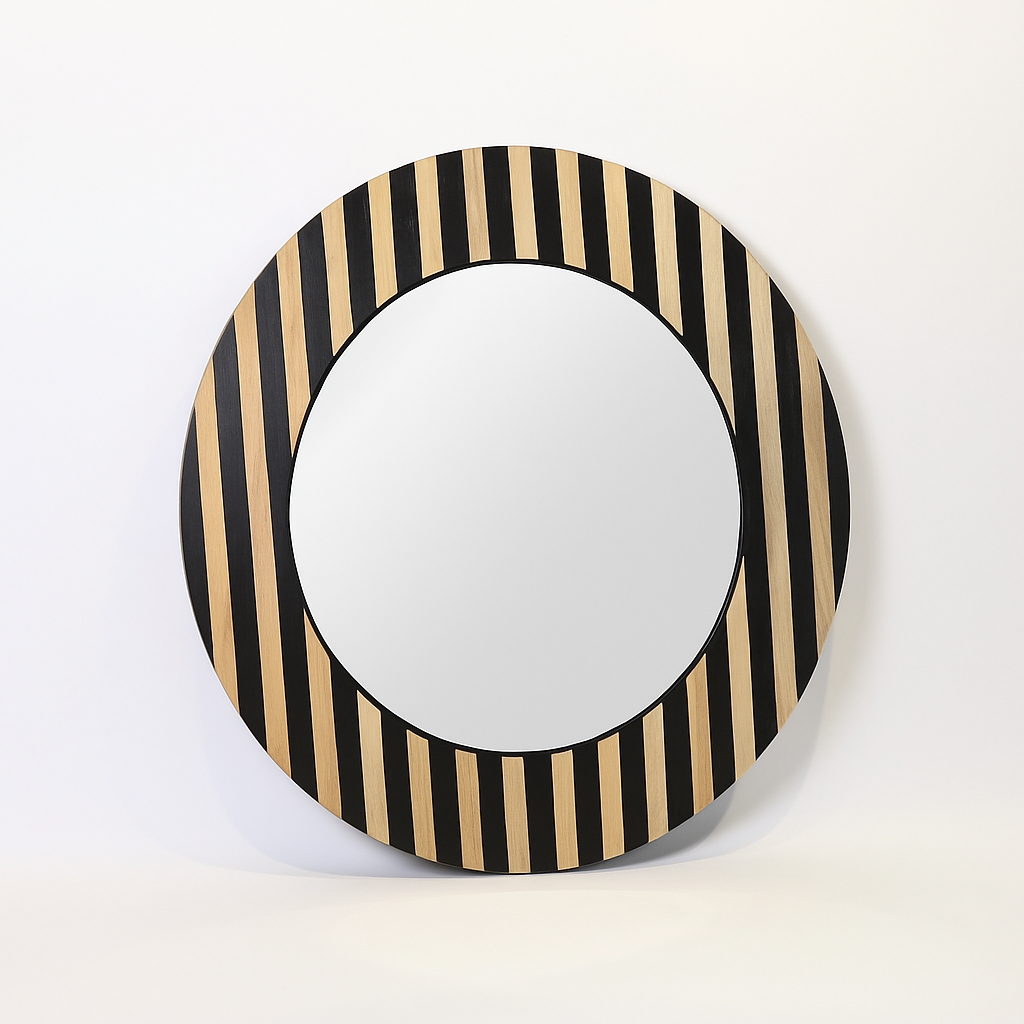 Cadre : décoré de rayures obliques alternant bois naturel clair et noir mat, créant un contraste graphique très élégant.