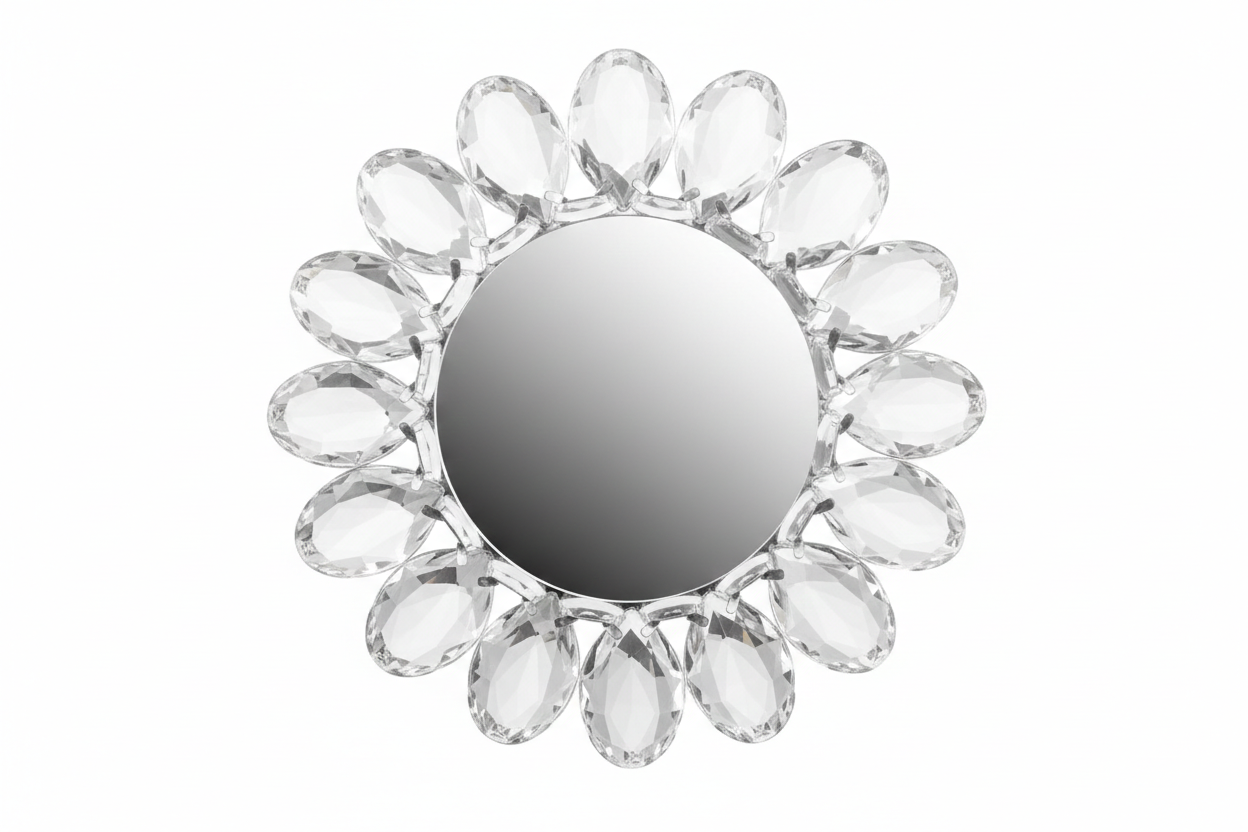 Inspiré du motif floral, le miroir adopte une forme circulaire évoquant une fleur délicate, telle une marguerite ou un tournesol stylisé. En son centre, un disque miroir parfaitement lisse est mis en valeur par une couronne décorative harmonieuse.