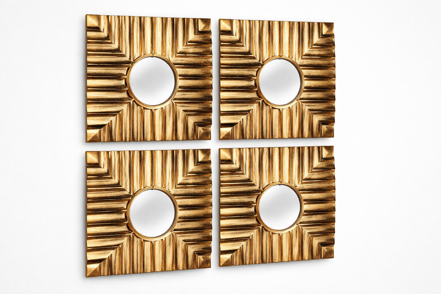 Chaque miroir est de forme carrée et présente au centre un miroir circulaire, créant un contraste harmonieux entre lignes droites et courbes. Le cadre, richement travaillé, adopte un relief géométrique en rayons, évoquant un effet soleil ou éventail, qui apporte profondeur et caractère à l’ensemble.