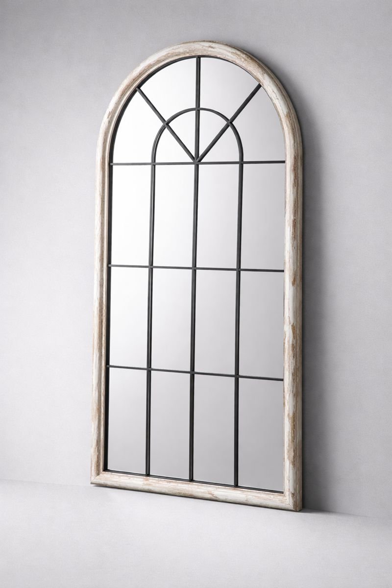 Le cadre extérieur en bois présente une finition blanchie et légèrement patinée, offrant un aspect authentique et chaleureux, idéal pour créer une ambiance à la fois naturelle et raffinée. À l’intérieur, le miroir est structuré par une armature en métal noir, formant un quadrillage géométrique rappelant les verrières d’atelier, ce qui lui confère une touche industrielle chic.