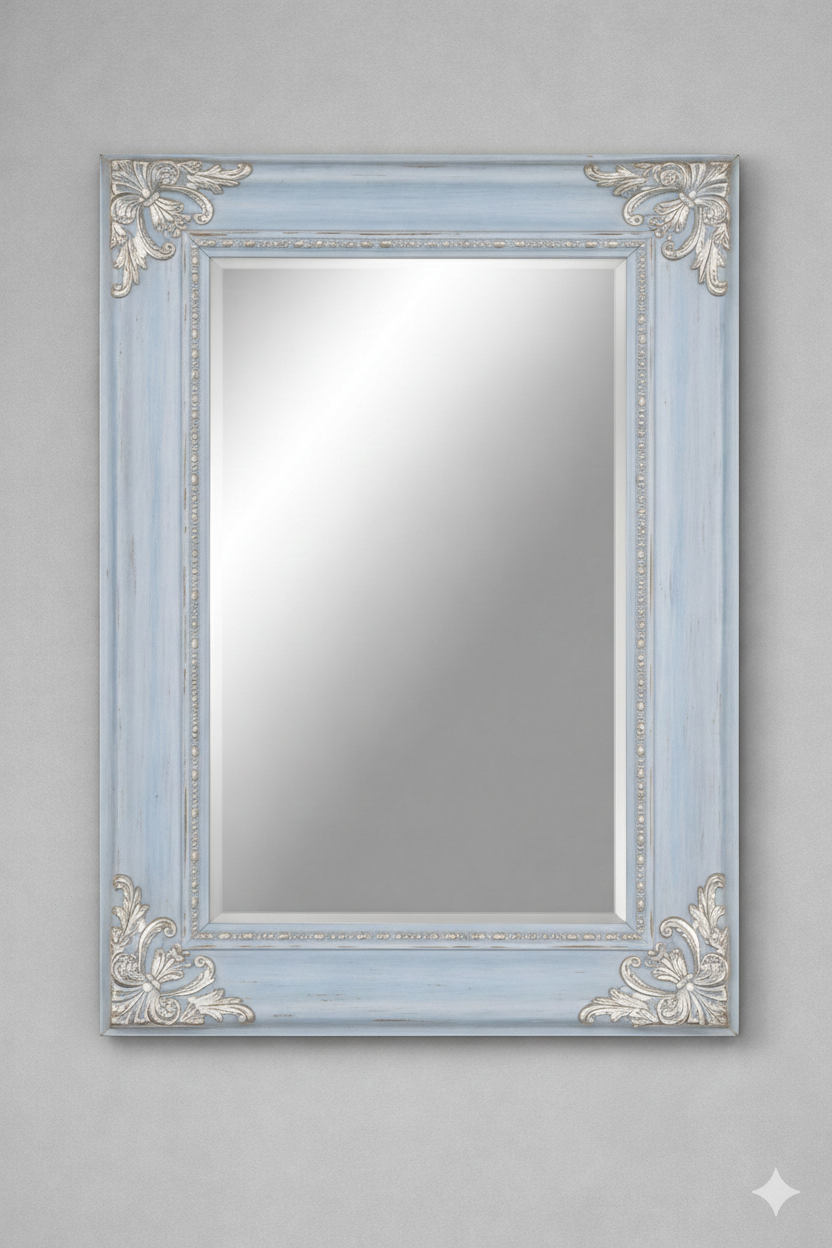Les angles du cadre sont richement ornés de motifs sculptés d’inspiration végétale, rappelant des feuilles d’acanthe et des arabesques décoratives. Ces ornements, dans une finition argentée ou blanc vieilli, créent un contraste subtil et élégant avec le bleu du cadre. Une moulure intérieure finement travaillée entoure le miroir, ajoutant une touche de sophistication supplémentaire.