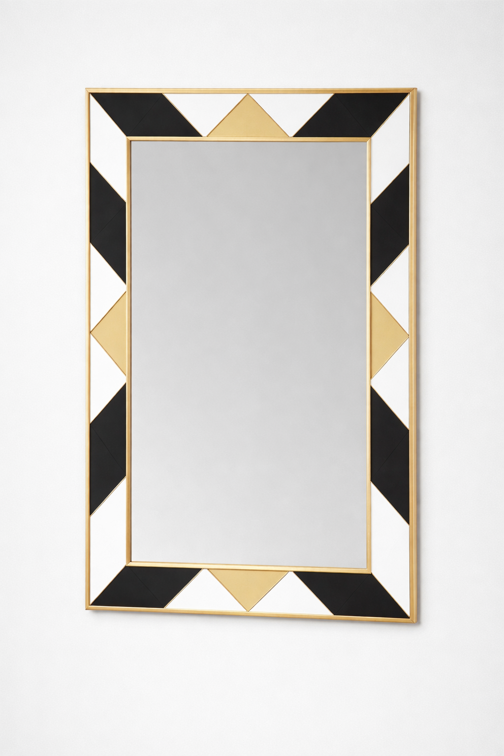 Son cadre décoratif se distingue par une alternance de motifs triangulaires noirs et blancs, rehaussés de touches dorées qui apportent une note luxueuse et raffinée. Un fin encadrement doré structure l’ensemble et met en valeur les contrastes de couleurs.
