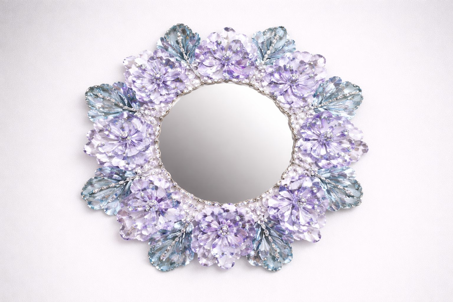 Le miroir central rond est entouré d’un cadre richement orné de fleurs et de feuilles décoratives, disposées de manière régulière tout autour. Les éléments floraux sont réalisés dans des matières translucides et brillantes, évoquant le cristal ou le verre taillé, ce qui confère à l’ensemble un aspect précieux et élégant.