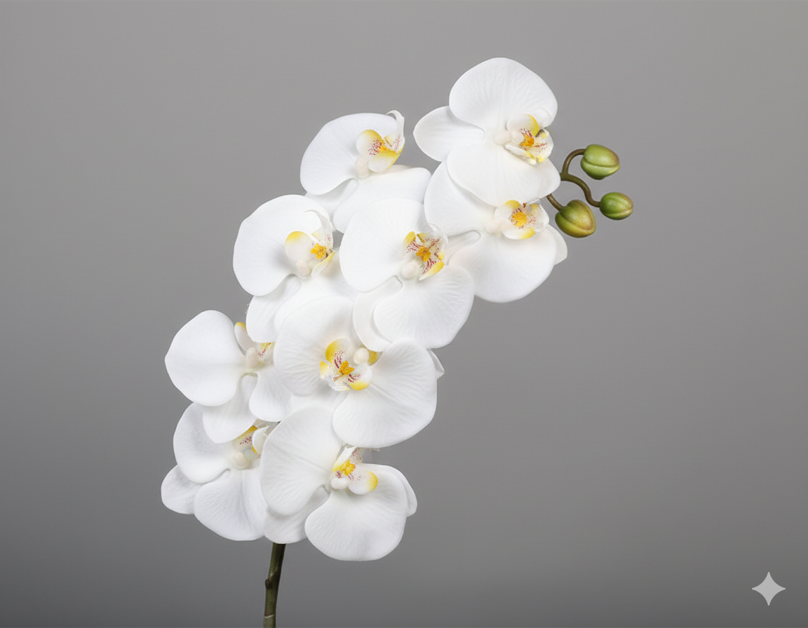 Symbole d’élégance et de pureté, cette orchidée Phalaenopsis artificielle présente de grandes fleurs blanches en cascade, rehaussées d’un cœur jaune et magenta. Avec ses boutons floraux et sa tige fine réaliste, elle apporte une touche raffinée et intemporelle à votre décoration.