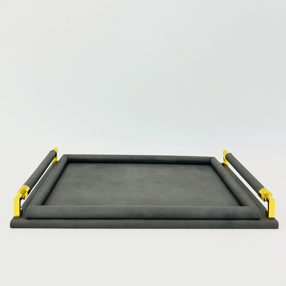 Plateau en cuir gris PM avec poignées dorées