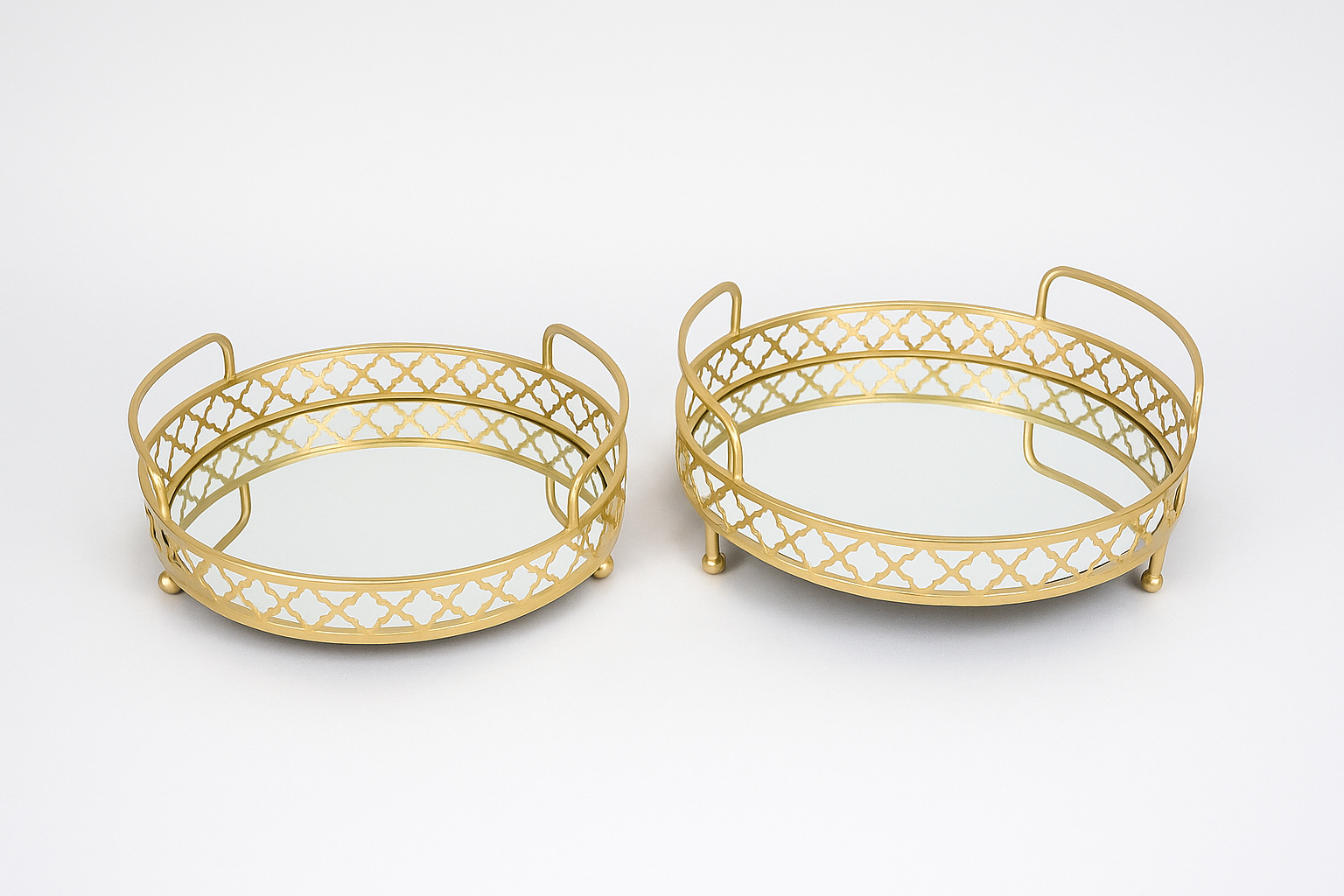 Leur bordure dorée présente un motif ajouré géométrique de style croisillon, apportant une touche sophistiquée et tendance. Munis de poignées latérales et de petits pieds ronds, ces plateaux allient praticité et élégance.