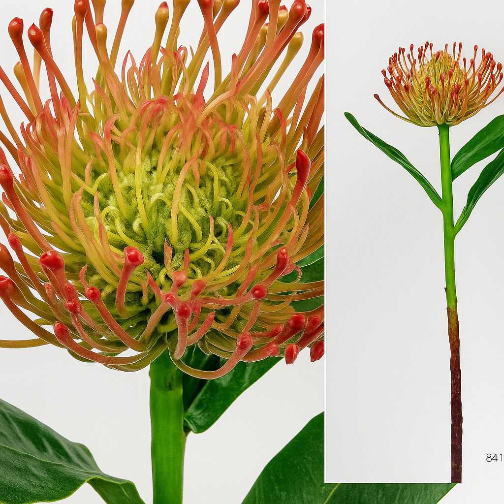 Fleur : Elle présente une forme ronde et dense, rappelant un coussin d’aiguilles, typique des proteas. Les pétales allongés et fins s’ouvrent vers l’extérieur comme de petites tiges recourbées. Leur base est vert-jaune vif et leurs extrémités se teintent d’un rouge-orange intense, créant un dégradé lumineux.
