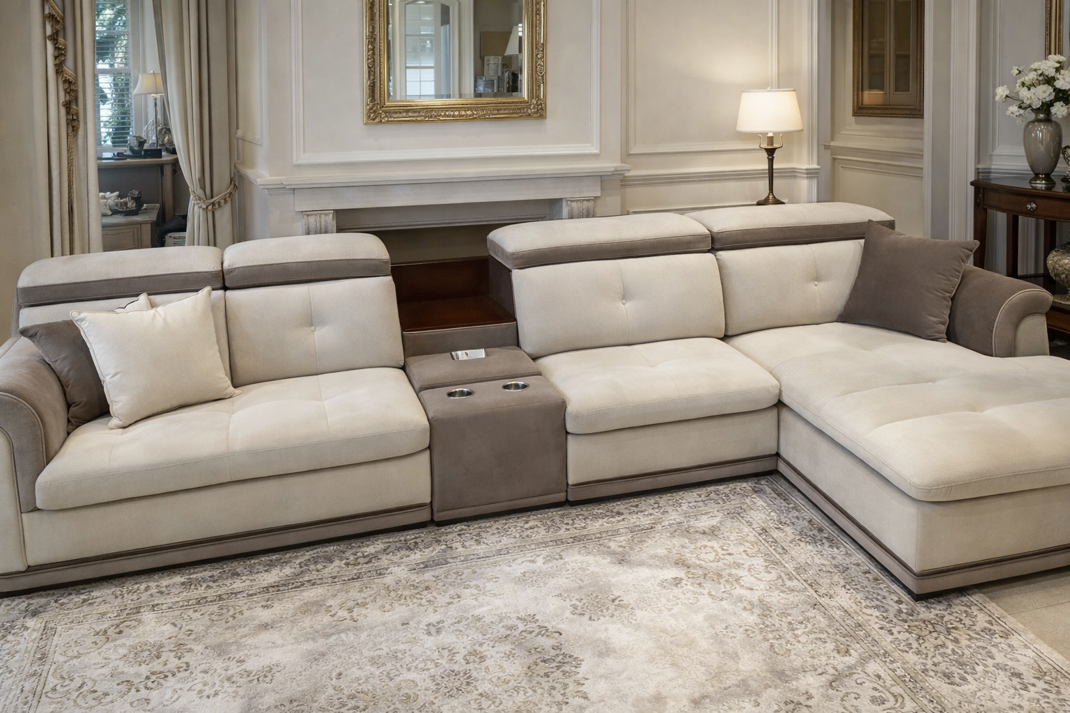 Au centre, un module console intégré avec porte-gobelets ajoute une touche pratique et fonctionnelle, idéale pour un usage quotidien ou pour recevoir. Les coussins assortis complètent l’ensemble en offrant un équilibre parfait entre esthétique et confort.