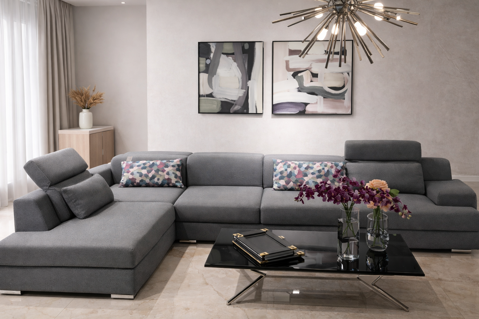 Le canapé est doté de dossiers réglables et ergonomiques, assurant un excellent confort d’assise et un soutien optimal. Sa structure robuste et ses lignes droites et équilibrées lui confèrent une allure à la fois moderne et raffinée. Les coussins décoratifs aux motifs contemporains apportent une touche de couleur subtile qui dynamise l’ensemble.