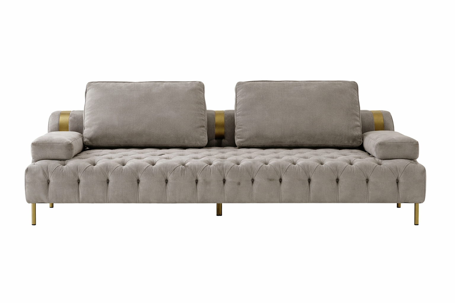 Les deux pièces partagent le même revêtement en tissu gris clair, un capitonnage soigné sur l’assise, ainsi que des accoudoirs structurés avec détails métalliques dorés et des pieds fins en métal, assurant une parfaite cohérence esthétique.