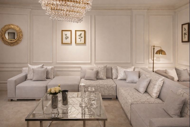 Le design du salon est équilibré et moderne-classique, avec des lignes nettes et une finition soignée. Ce salon gris donne une impression de calme, de luxe discret et de confort, idéal aussi bien pour un espace familial que pour un séjour élégant.