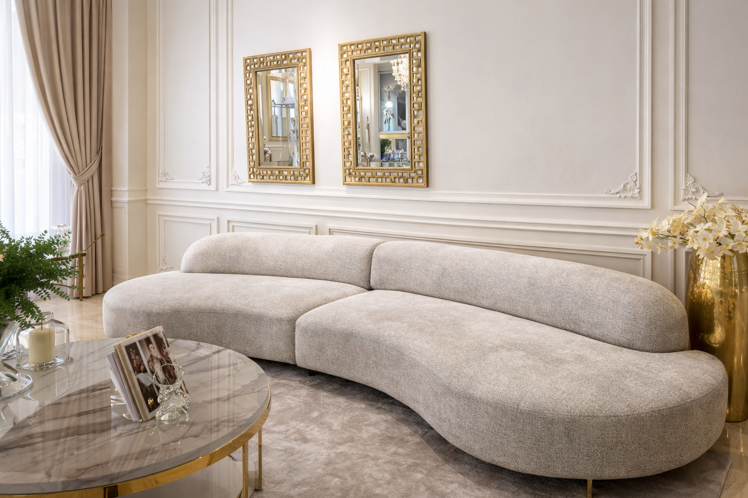 Il se compose d’un canapé aux lignes courbes et organiques, offrant une silhouette douce et enveloppante. Cette forme continue crée une atmosphère chaleureuse et accueillante, idéale pour les espaces de réception modernes ou classiques chic. Le revêtement en tissu clair à texture fine apporte luminosité, raffinement et une sensation de confort visuel et tactile.