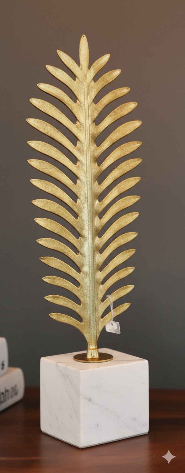 Sculpture décorative raffinée représentant une feuille de palmier stylisée en métal doré, montée sur un socle en marbre blanc. Son design chic et minimaliste apporte une touche élégante et moderne à toute décoration intérieure.