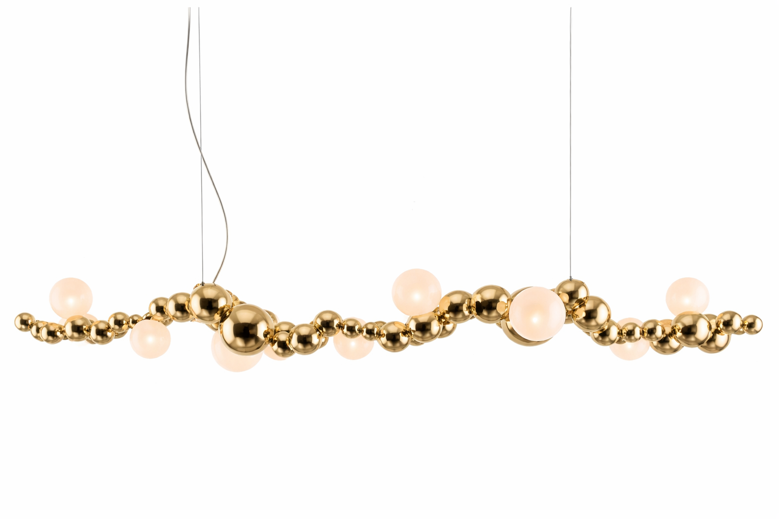 Composée de sphères dorées brillantes associées à des globes en verre opalin, elle crée un équilibre parfait entre modernité et sophistication. Sa forme fluide et aérienne transforme instantanément votre espace en un lieu chic et tendance.