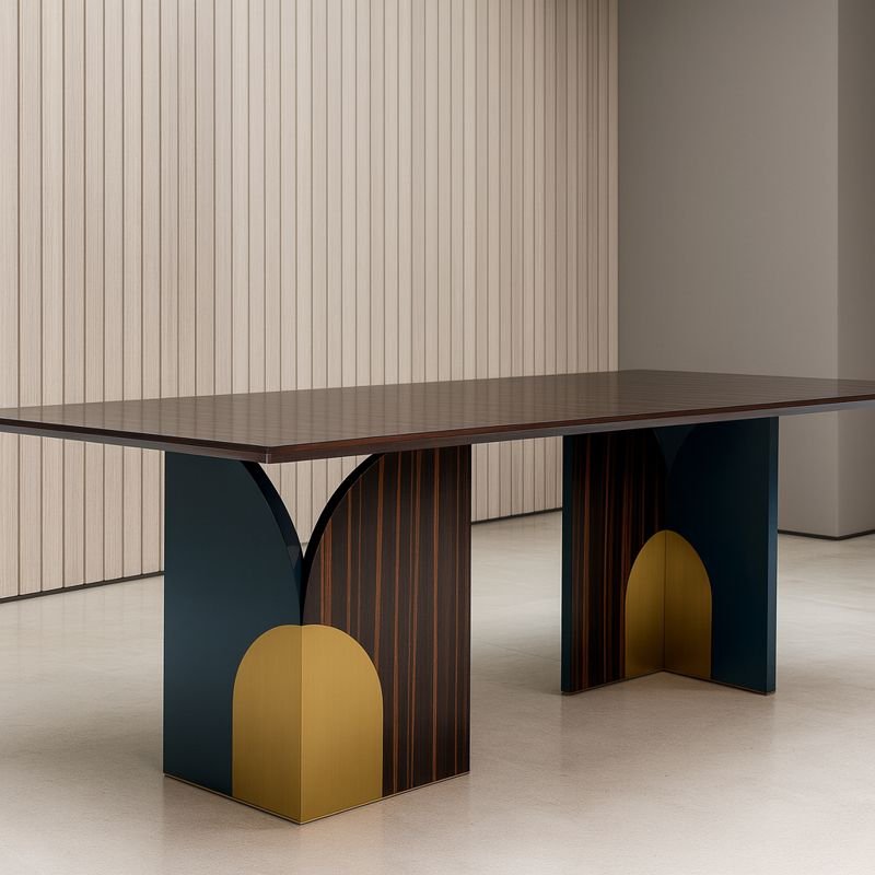 La table repose sur deux piétements centraux sculpturaux, également en bois, composés de panneaux aux formes architecturales arrondies. Ces piétements associent différentes finitions bois, créant un contraste visuel moderne tout en conservant une harmonie naturelle. Leur conception assure une excellente stabilité et libère l’espace autour de la table pour un confort optimal des convives.