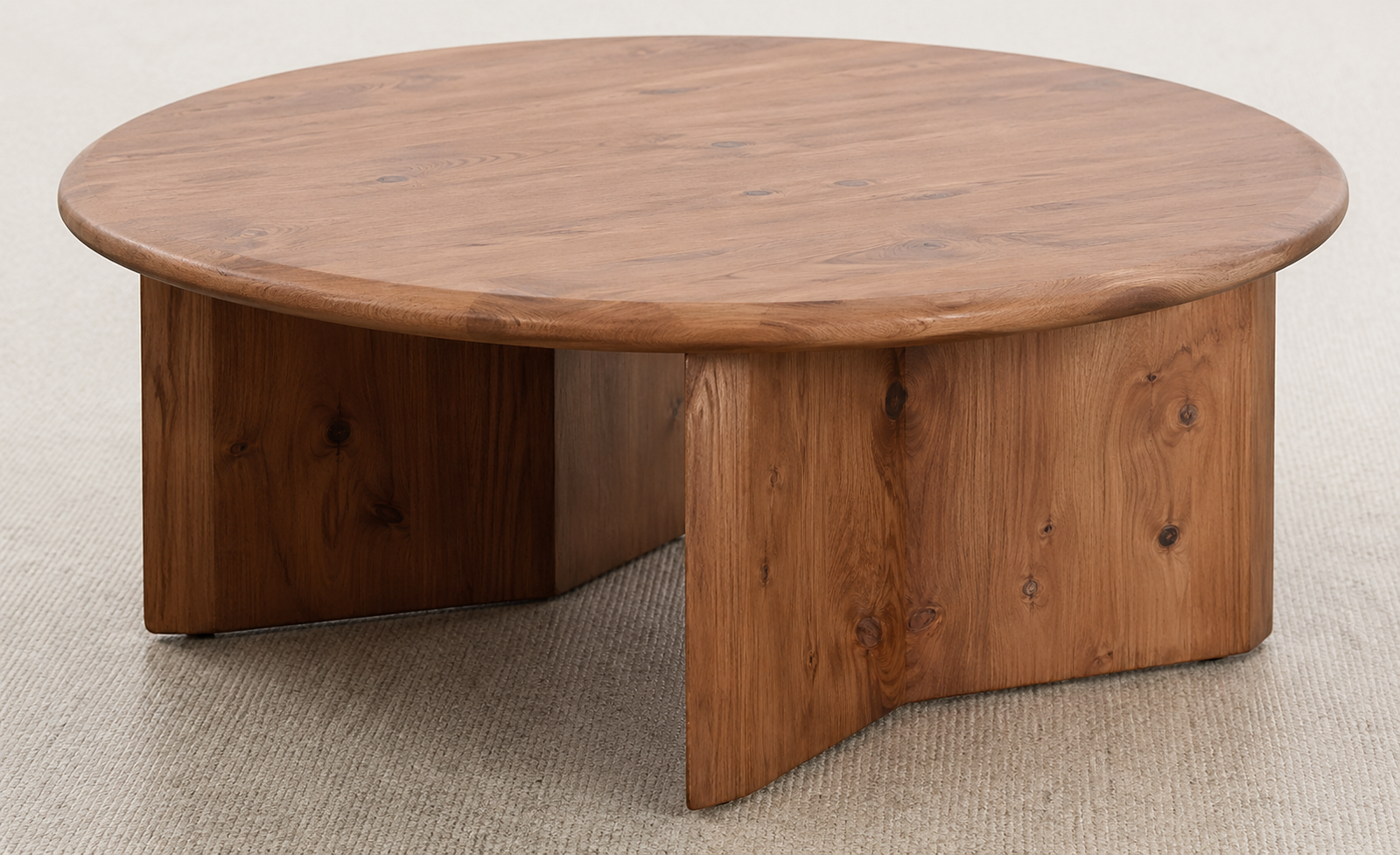 Le plateau est épais, avec des bords légèrement arrondis, ce qui lui donne un aspect robuste et soigné. Le piètement est constitué de panneaux verticaux en MDF disposés en croix ou en sections courbées, assurant une bonne stabilité tout en apportant une touche architecturale moderne.