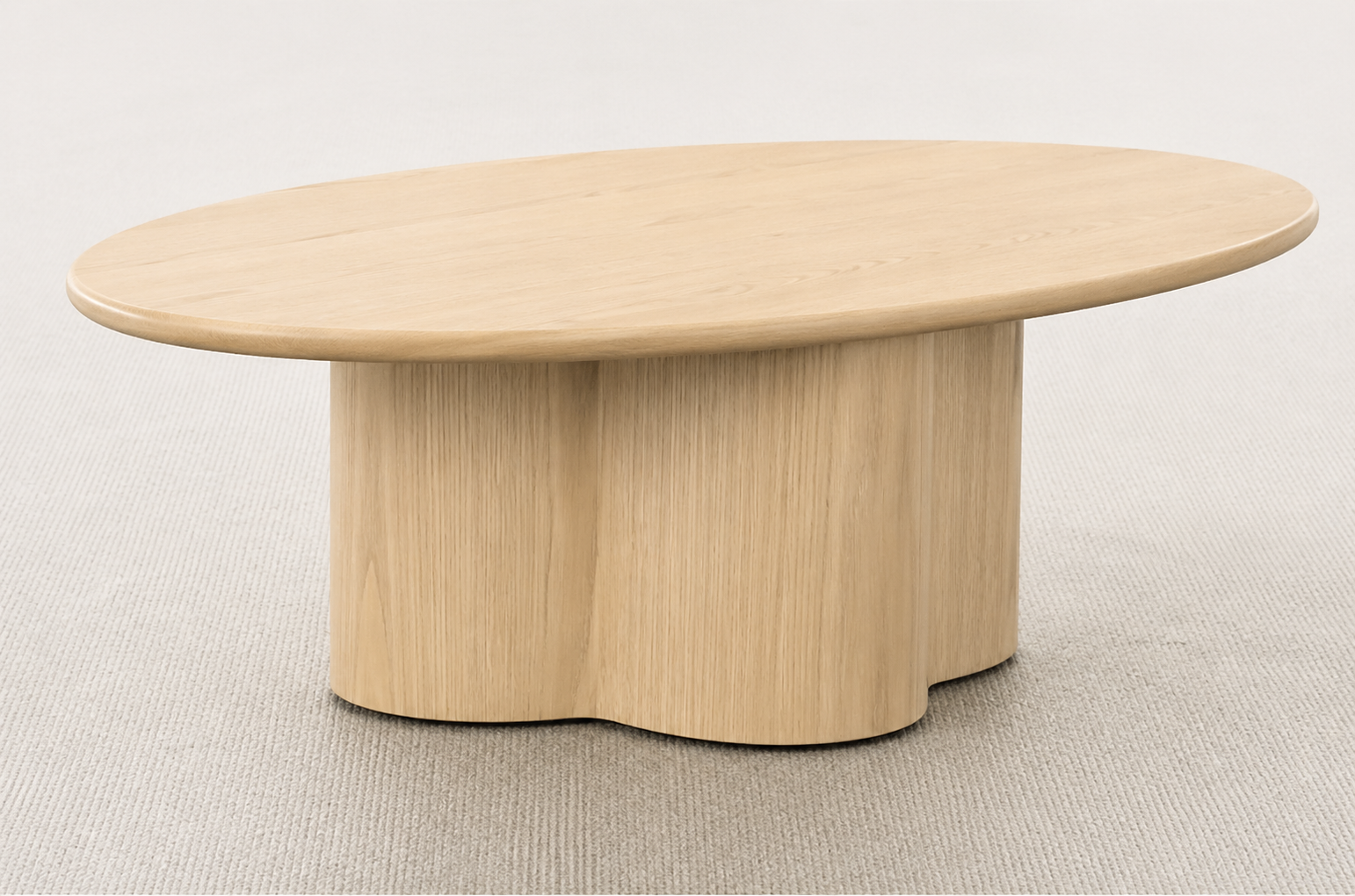 Le plateau adopte une forme ovale légèrement allongée, avec des bords arrondis et une épaisseur visuellement confortable, renforçant son aspect qualitatif. La base est constituée d’un piètement central plein, formé de volumes courbés et continus, ce qui crée un effet sculptural tout en assurant une excellente stabilité.