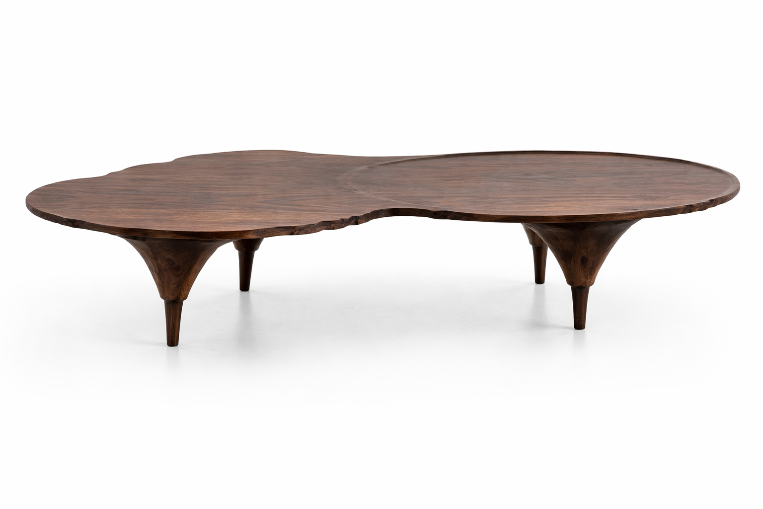 Le plateau en bois massif adopte une forme libre et asymétrique, avec des contours irréguliers qui rappellent une finition « live edge ». Le veinage du bois est clairement visible, apportant chaleur, authenticité et un caractère unique à chaque pièce. La finition soignée met en valeur la richesse naturelle du matériau tout en conservant un aspect haut de gamme.