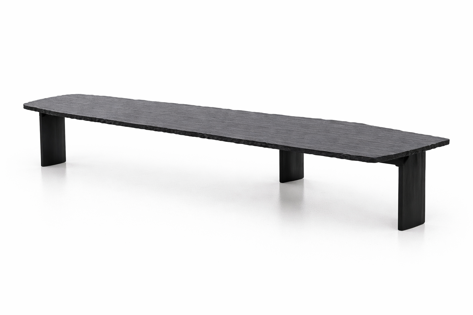 Le plateau rectangulaire allongé est fabriqué en MDF, avec une finition texturée imitant l’aspect du bois naturel. Les bords irréguliers de style “live edge” apportent un rendu visuel organique et tendance, tout en conservant une structure maîtrisée et élégante. La couleur sombre renforce le caractère moderne et sophistiqué de la table.