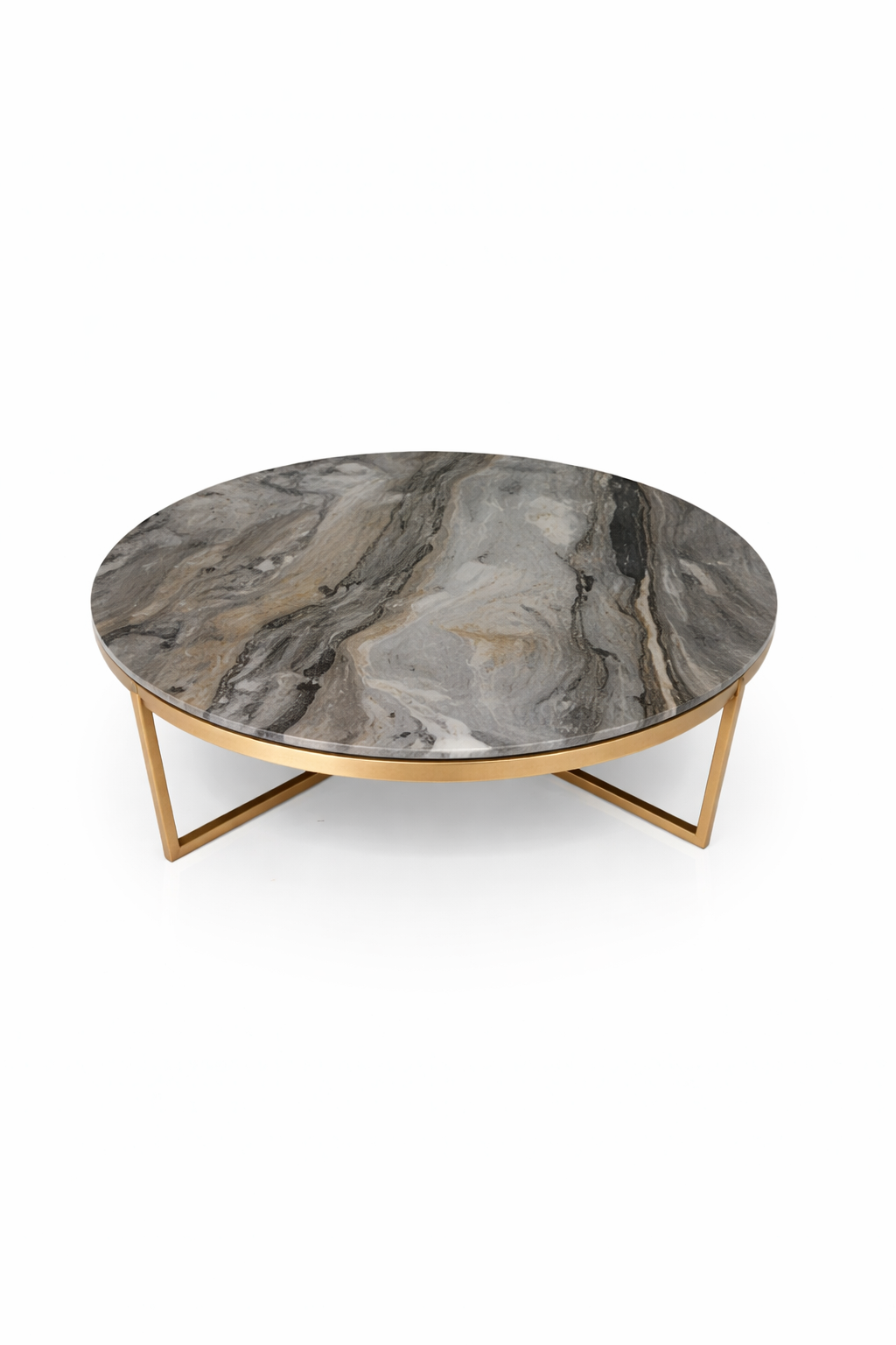 Le plateau rond en céramique présente un élégant effet marbré, avec des veinures naturelles dans des tons de gris et de nuances minérales. La céramique offre un rendu très proche du marbre tout en étant plus résistante, facile d’entretien et adaptée à un usage quotidien.