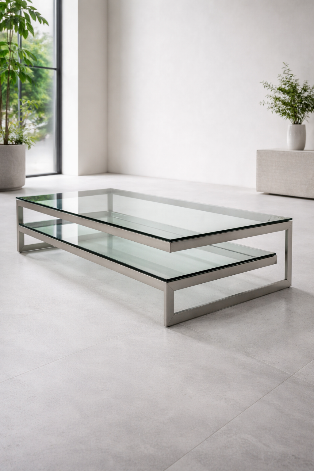 Table basse d’importation se distingue par son design moderne et épuré, idéal pour les intérieurs contemporains. Elle est composée de deux plateaux rectangulaires en verre trempé transparent, offrant une sensation de légèreté visuelle tout en garantissant solidité et durabilité.