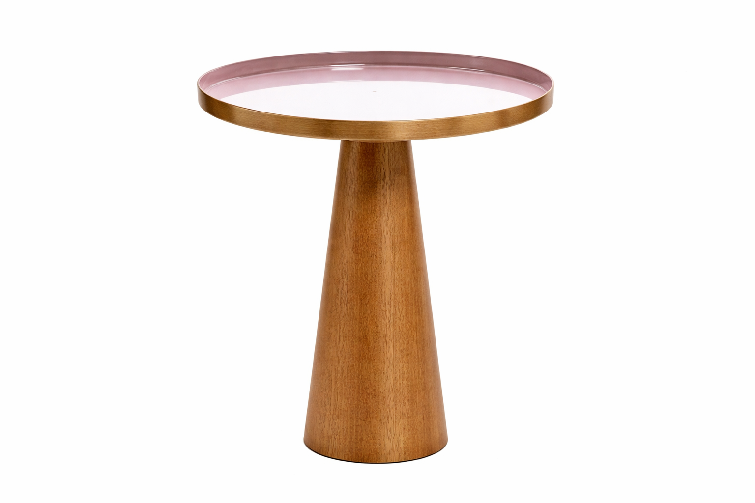 Elle se compose d’un plateau circulaire à la surface lisse et brillante, bordé d’un rebord fin légèrement teinté rosé, qui apporte une touche moderne et originale. Ce détail contraste délicatement avec la simplicité du plateau et lui donne un aspect chic.