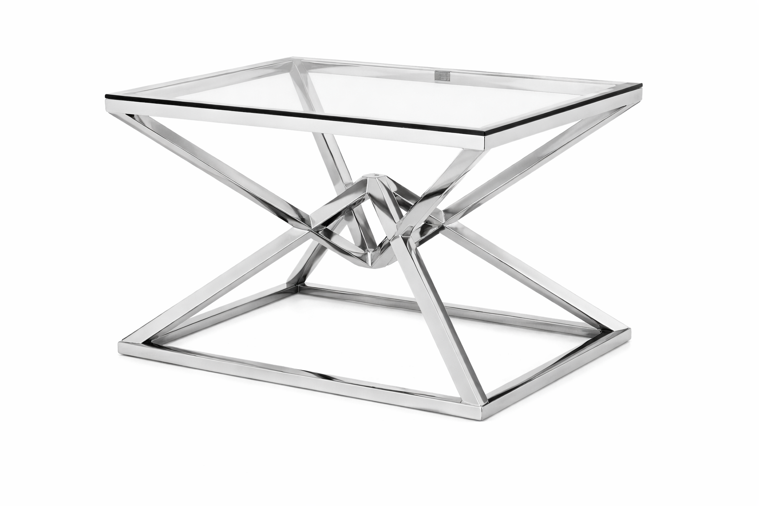 Structure : le piètement est conçu en inox finition argent brillant, avec une architecture géométrique en croix (X). Les lignes angulaires se rejoignent au centre autour d’un élément décoratif facetté, renforçant l’aspect design et sophistiqué.