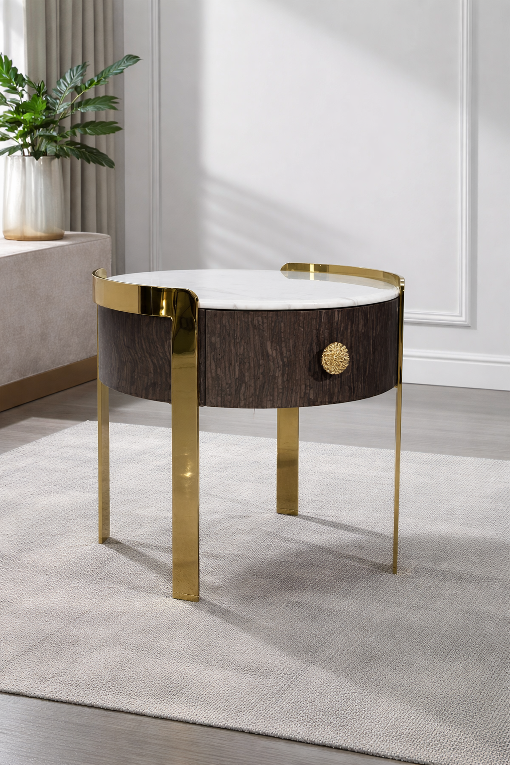 La surface supérieure est en marbre blanc, délicatement veinée, offrant un contraste élégant avec le bois foncé et le métal doré. Ce plateau en marbre renforce le caractère haut de gamme du meuble tout en garantissant durabilité et facilité d’entretien.