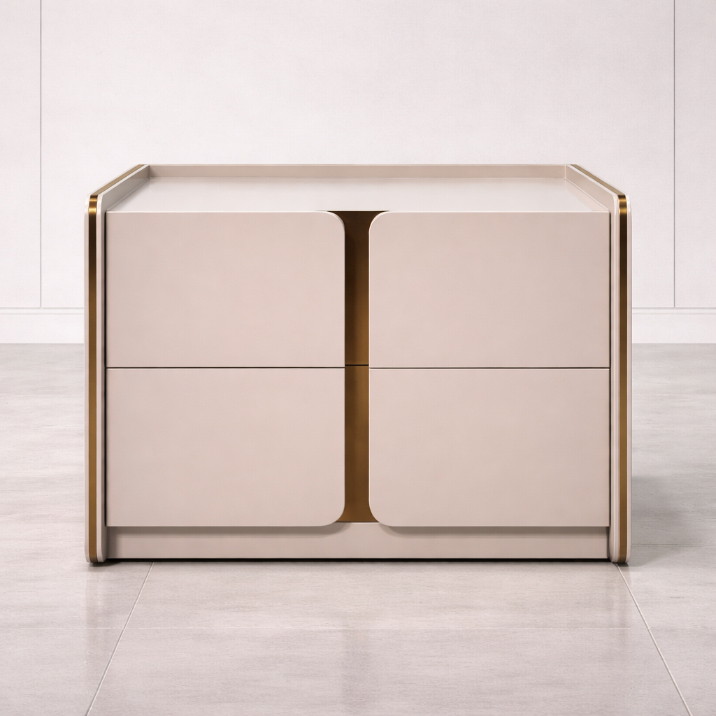 Cette table de nuit d’importation se distingue par son design moderne et épuré, avec une finition beige mate élégante et de subtiles touches dorées qui apportent une note luxueuse. Dotée de deux tiroirs spacieux, elle allie fonctionnalité et raffinement, idéale pour une chambre contemporaine.