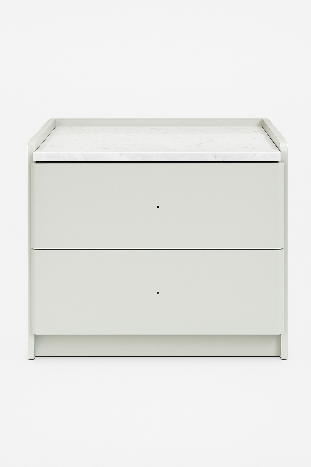 Cette table de nuit présente un design moderne et épuré. Elle est composée de deux tiroirs sans poignées apparentes, avec une façade lisse dans un ton gris clair ou vert sauge doux, qui lui confère un aspect raffiné et minimaliste.