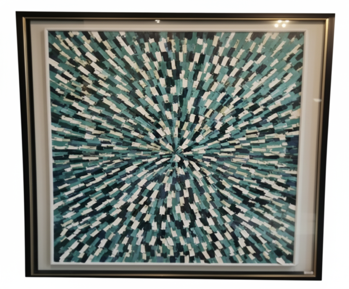 Plus on s’éloigne du centre, plus les formes s’élargissent et s’espacent, évoquant un rayonnement en expansion. Le tout est mis en valeur par un passe-partout blanc et un cadre sombre, qui apportent une finition élégante et contemporaine.