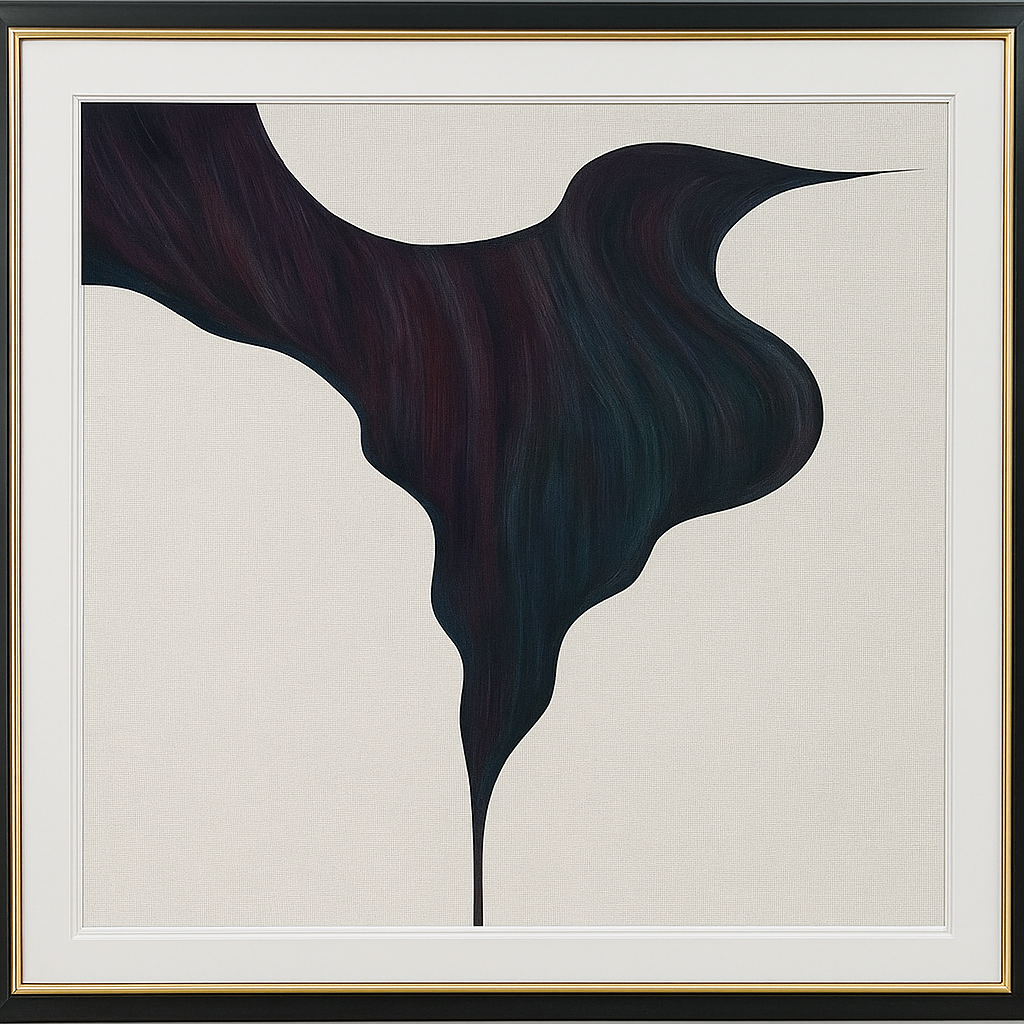 La forme principale est sombre, mêlant des nuances profondes de noir, de violet et de bleu nuit, avec des reflets subtils qui évoquent un effet de matière ou de texture soyeuse. Le contraste est marqué par le fond clair, de ton beige ou blanc cassé, qui met en valeur la sinuosité et l’élégance de la silhouette centrale.