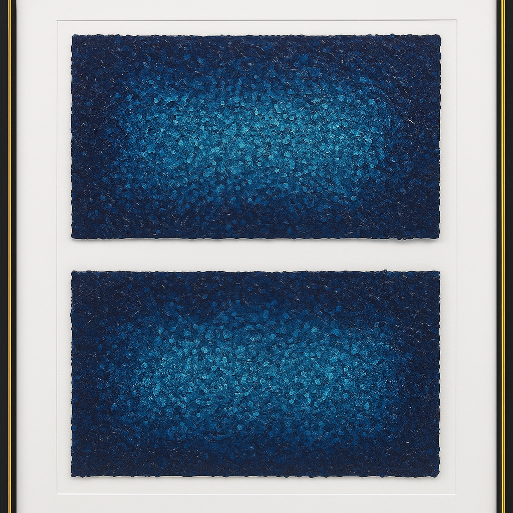Chaque rectangle est travaillé dans des nuances profondes de bleu, allant du bleu nuit au bleu turquoise. Les petites touches ou fragments de couleur créent un effet de matière riche et vibrant, rappelant des mosaïques ou des reflets aquatiques. La lumière semble se concentrer au centre de chaque panneau, produisant un subtil dégradé qui apporte profondeur et dynamisme.