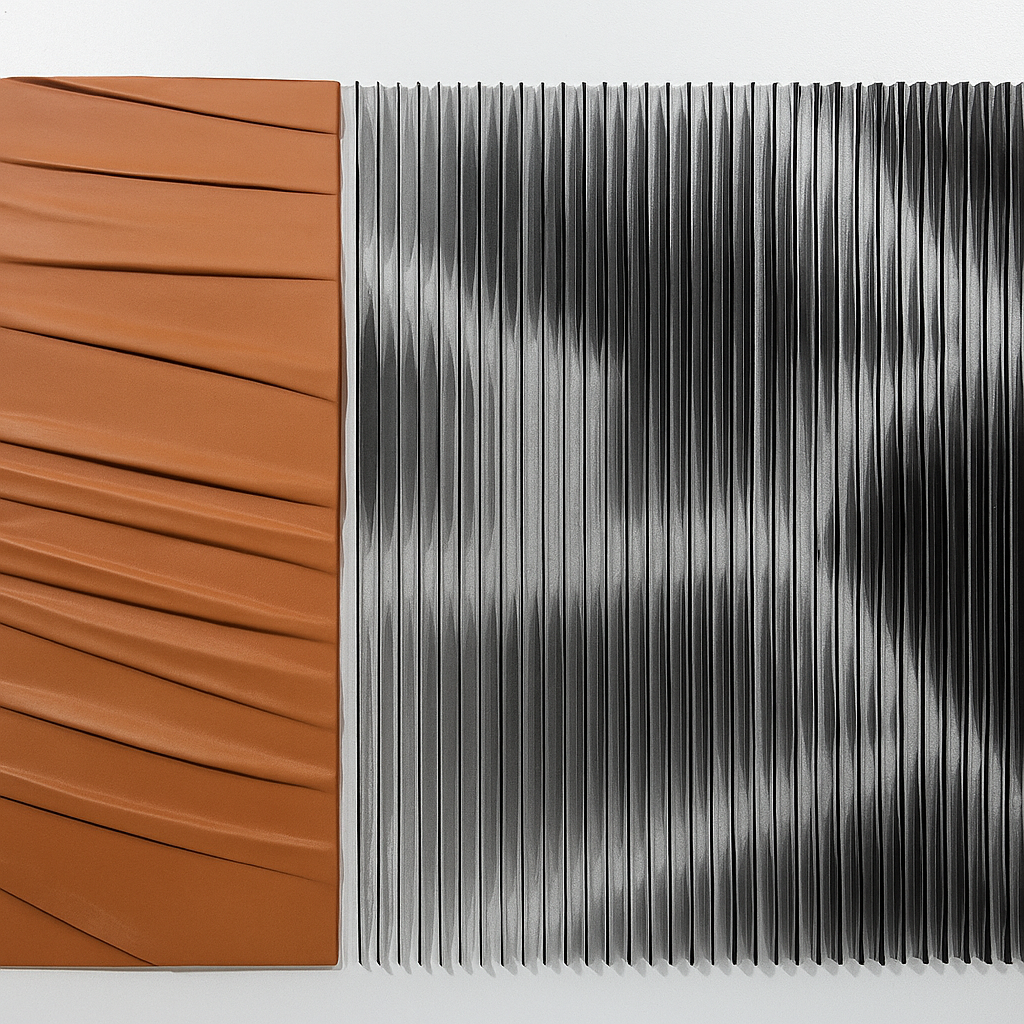 À gauche, une surface de couleur terre cuite (brun orangé) présente un relief plissé et oblique, formant des plis horizontaux et diagonaux qui créent un jeu de lumière et d’ombre. Cette partie donne une impression de matière souple ou drapée figée dans le temps.