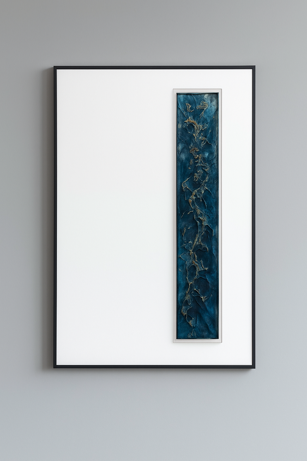 Ce tableau est une œuvre moderne et minimaliste. Il est présenté dans un cadre rectangulaire noir fin. La partie principale est constituée d’un large fond blanc épuré, au centre duquel se trouve une bande verticale étroite.