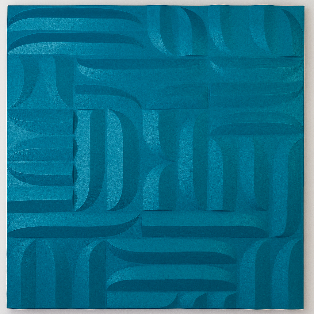 Ce tableau est une œuvre abstraite monochrome de couleur turquoise/bleu vif. Il est composé d’un jeu de formes géométriques en relief qui se répètent sur toute la surface.